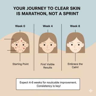Treatment may take 4 weeks to show results. If you have moderate to severe active inflammatory papules, a longer period of treatment (e.g., three months) may be necessary before considering options like Isotretinoin (oral medication). The body’s cellular turnover rate and the time it takes for inflammation to subside simply require patience.